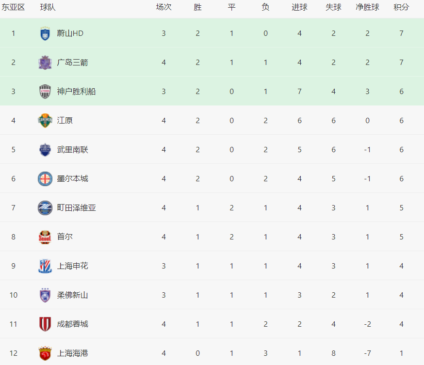 在亚冠东亚区的积分榜上,排名第1的是蔚山HD,2胜1平拿到7分。广岛三箭也是7分,排名第2。中超的3支球队都不在前8,处于淘汰区。上海申花只踢了3场,1胜1平1负,拿到4分,排名第9。成都蓉城踢了4场,1胜1平2负,拿到4分,排名第11,也就是倒数第2。上海海港最耻辱,1平3负,只拿到1分,排名垫底。中超的3支强队在亚冠赛场就是一个大笑话,战绩惨不忍睹,丢人现眼。