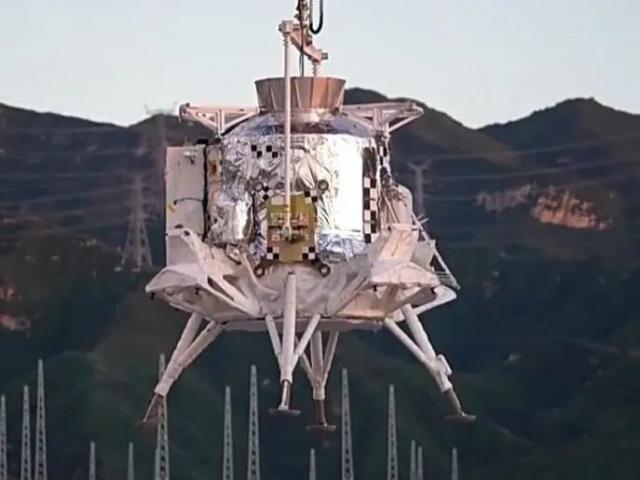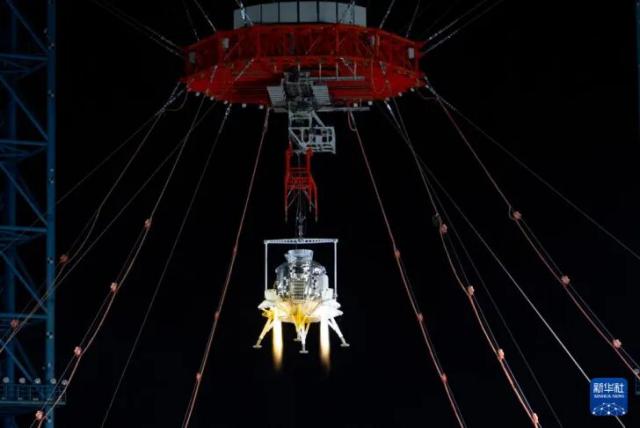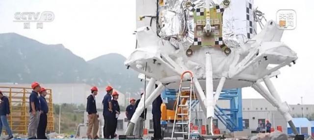 科研人员正在对登月舱进行测试,可以大致感受到登月舱的大小(图片来源:央视新闻)