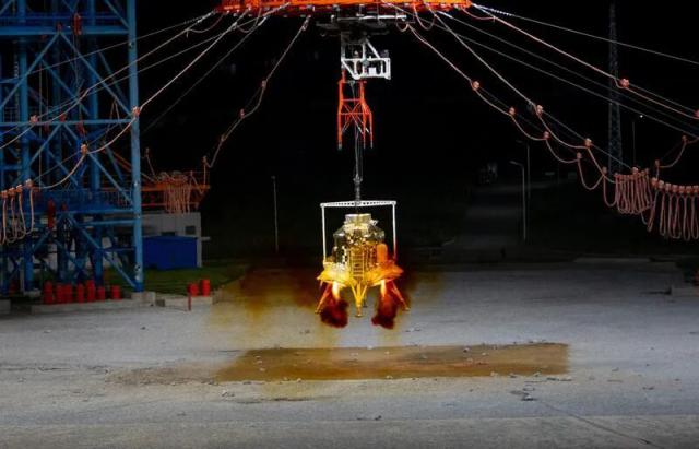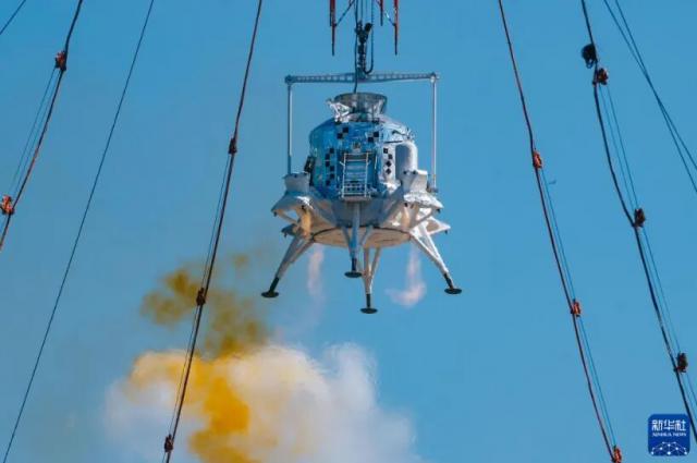 揽月月面着陆器着陆起飞综合验证试验过程,可看到发动机处于工作状态(图片来源:新华社)